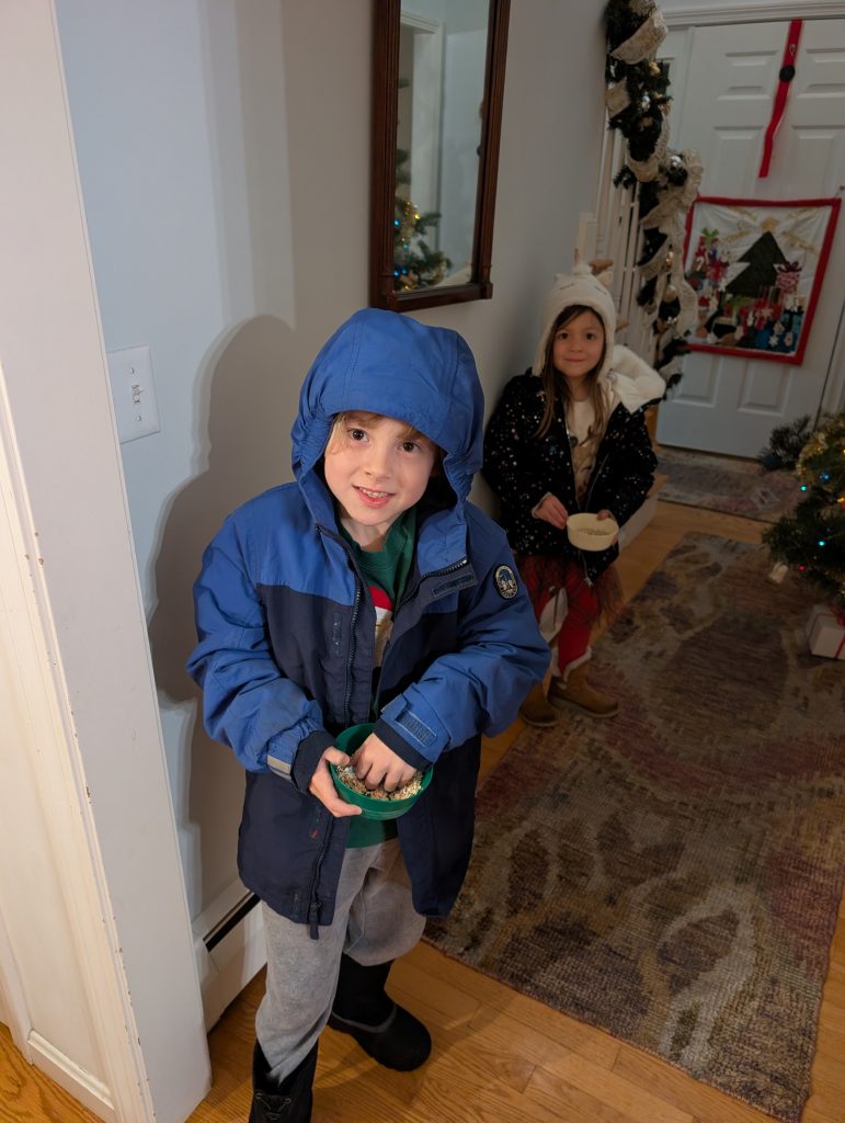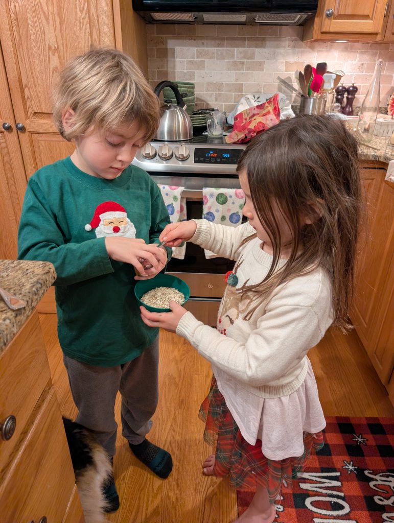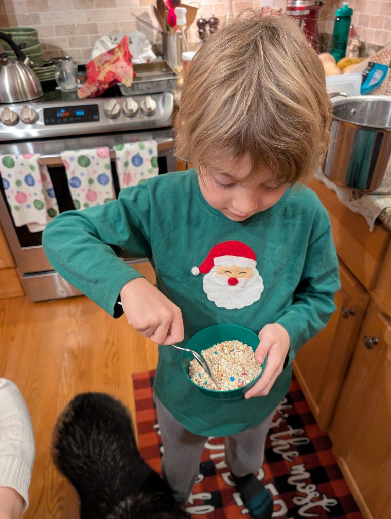 I have a couple things to show you that a made as presents for Christmas this year, but this week I wanted to show you something silly the kids and I did. Patricia came home before Christmas with reindeer food that she was supposed to sprinkle on the lawn to attract Santa’s reindeer to make sure they didn’t miss our house. They were really excited about it but to me it looked like oats mixed with silver glitter… and I’m going to guess the glitter would not be ideal for animals to eat (though I guess we all have a plastic spoon work of microplastics in our brain already… but I want to avoid contributing…) I told the kids that I was worried about the glitter being made of plastic and that we could definitely make our own. Julius was pretty convinced that it wouldn’t work without the glitter because it was reflective to attract the reindeer. Luckily I have a stash of sprinkles (read this as: I have a whole cabinet of sprinkles because I’m a crazy person.) We were able to find a suitable substitute! We used the Sweetapolita Flight of the Unicorn sprinkles with silver edible glitter stars and small silver dragees. (Yes I know these are no longer considered edible by the FDA but Canada still thinks they are and under this regime I’d trust Canada more with my life than the US. Just don’t eat a bucketful!)