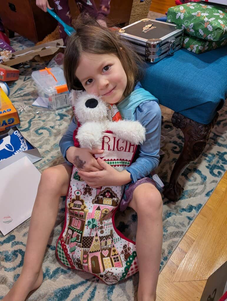 That night Santa came! I was a bit worried he might pass us by because Will and I ended up staying up way too late… The kids this year wrote Santa a note and left out their autograph books which Santa signed! They must have been very good kiddos because they got way too many toys this Christmas. I have no idea where we are going to put everything. I nearly forgot to mention that Julius woke up at 5am Christmas morning with a high fever! So we gave him some Tylenol and sent him back to bed and luckily he felt well enough to open presents at 8am. Then he immediately tucked himself into bed for a nap… My parents came over later in the afternoon with MORE presents before they headed out. Julius seemed to like the easy bake oven the most… and Patricia loved this weighted stuffed cow she got from aunt Mary Elizabeth (fun fact, we got stopped both there and back for the cow. They had to test every seam for explosives…)