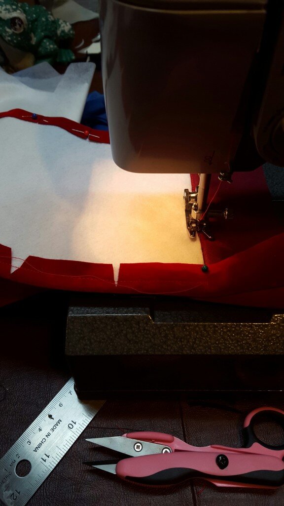 Then I sewed the cone segment (right sides together) down the side to form my fez, and attached the top (right sides together). I snipped the top and and bottom fabric up to the interfacing to make it lay flat. Finally a sewed a hem around the entire bottom of the hat.
