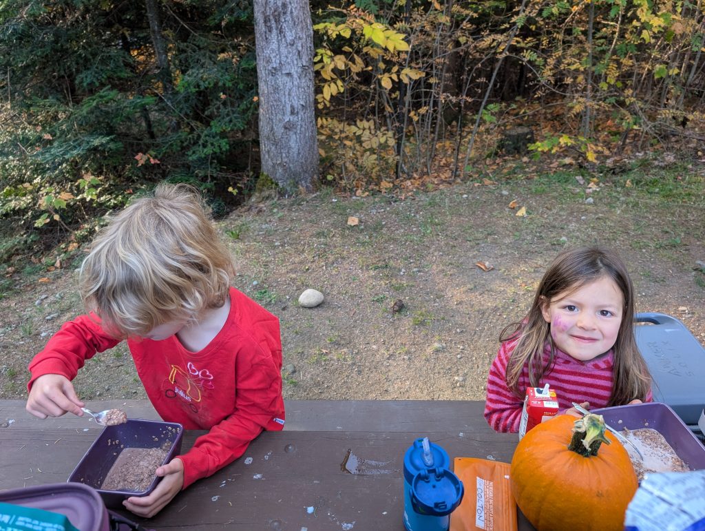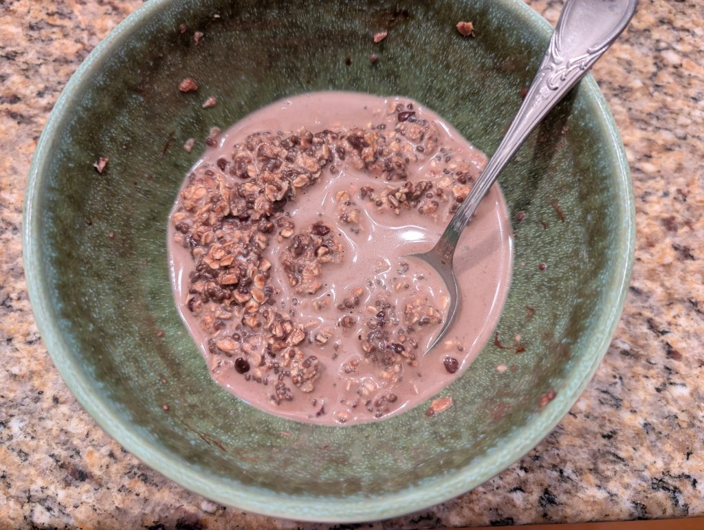 Speaking of hot cocoa… when camping I started buying the little prepackaged bags of oatmeal because it was easier. I like the Kodiak brand because it has slightly less sugar, and supposedly more protein (not sure how). Julius and I decided we preferred the chocolate chip version. I decided that I could make that for way cheaper (and plastic free). Julius has eaten several variants, as have I. I decided this is my favorite version. It’s reminiscent of a hot cocoa oatmeal… Note that powdered milk has a lot of sugar in it. That’s where most of the sweetness comes from in this recipe, but the mini chocolate chips add a little pop of sweetness. I don’t think this is cloyingly sweet though, and those used to the grocery store version may be disappointed. Fair warning. And full confession – I eat it after the kids go to bed as a dessert sometimes.