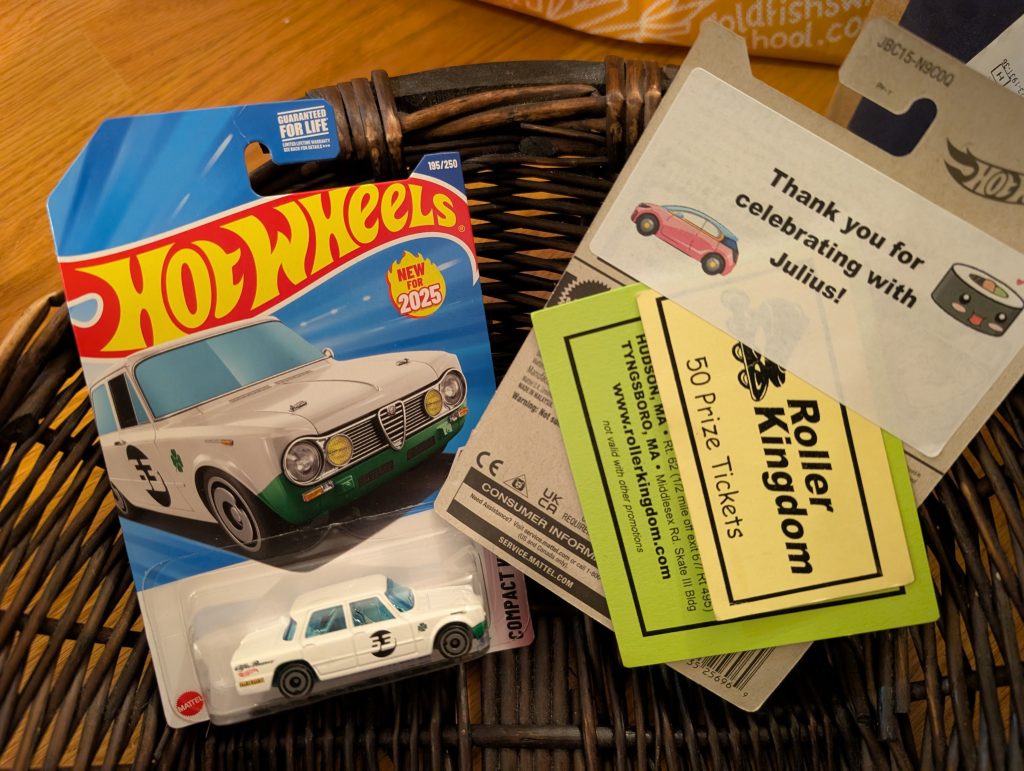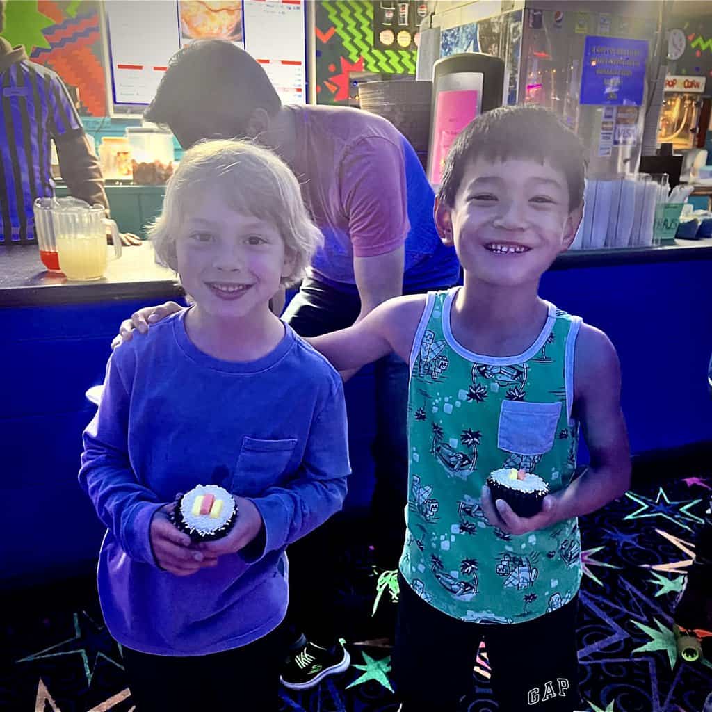 The good news was Julius’ party was a synch. I only needed to provide cupcakes (I could have bought them but what’s the fun in that) and party favors (which I did buy). I never do typical party favors. I know this is an unpopular opinion but I feel like the favors frequently get thrown in the trash so I like to spend the money on activities they can do and take home at the end of the party. And Julius’ party was EXPENSIVE. So I wasn’t about to drop $5 more per kid for trinkets. Instead Julius and I bought a bunch of matchbox cars at dollar tree for $1.25 a piece (Julius loves matchbox) and I stuck a sticker on the back with the 50 prize tickets and free admission that came with the roller skating package. That seems like a pretty great favor to me…
