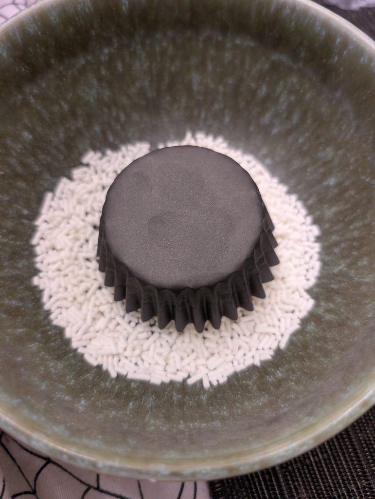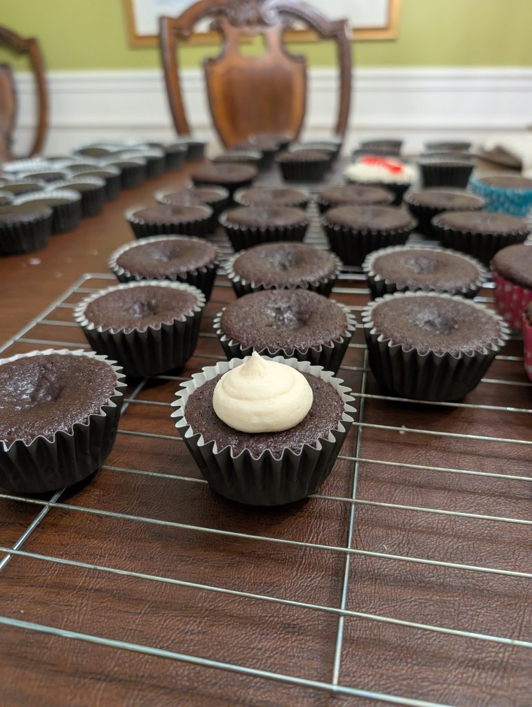 The first step was baking the cupcakes with black cupcake liners, then whipping up a batch of white icing.
