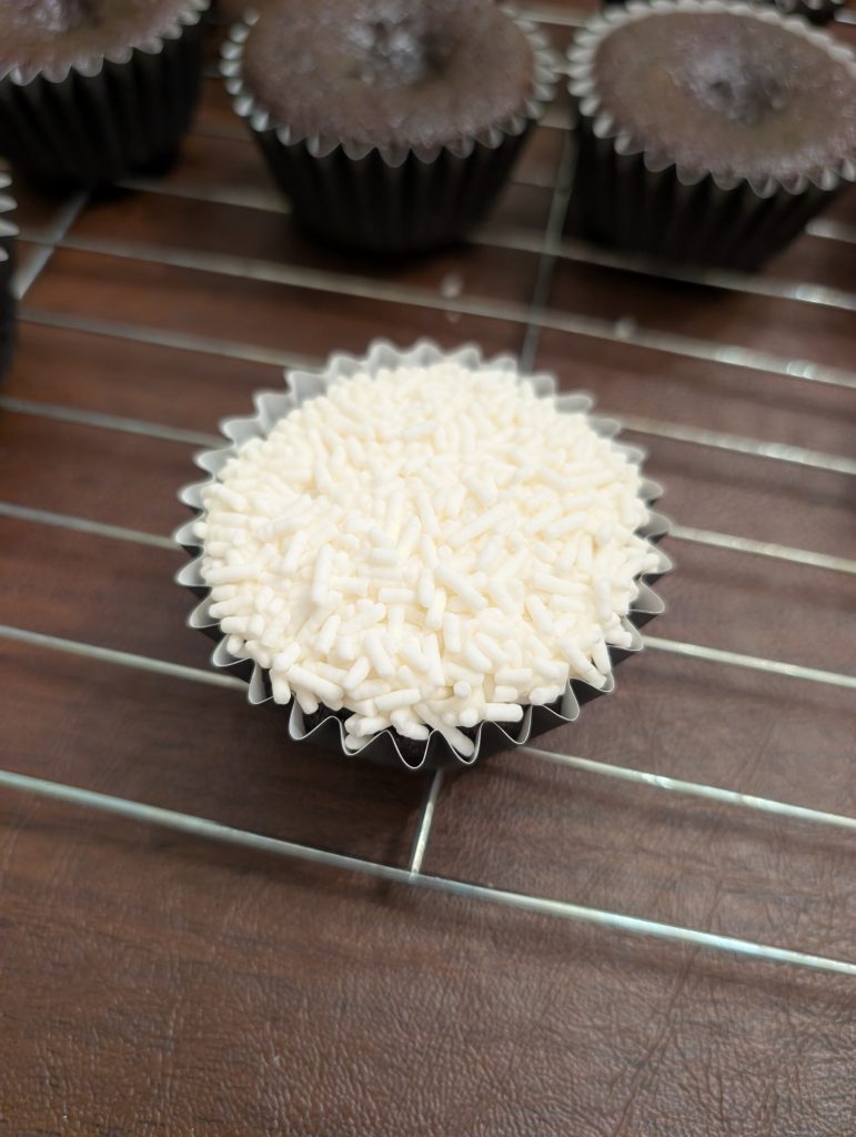 Then I pressed the cupcake into a bowl of white sprinkles, flattening out the icing.