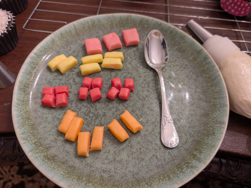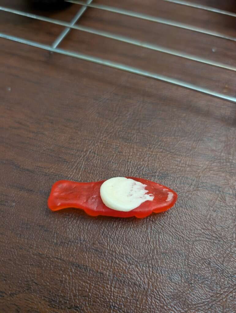 Then I used a spoon to press down on the frosting a bit in the center. On top of this I added a small blob of frosting and added the Starburst fish pieces.