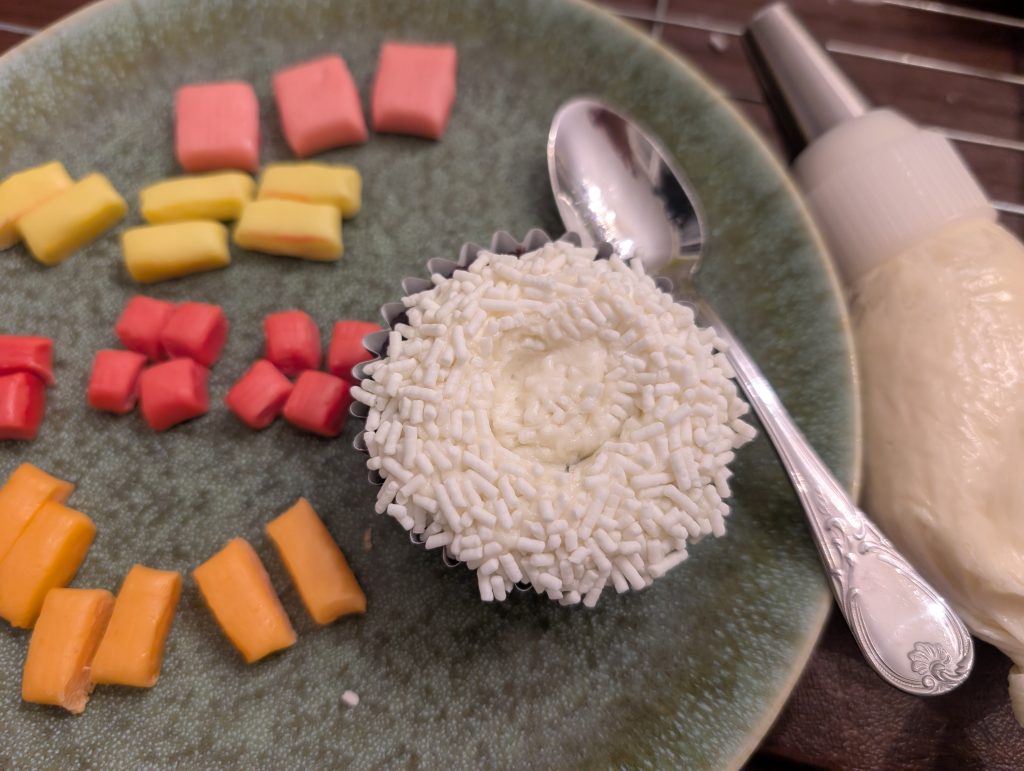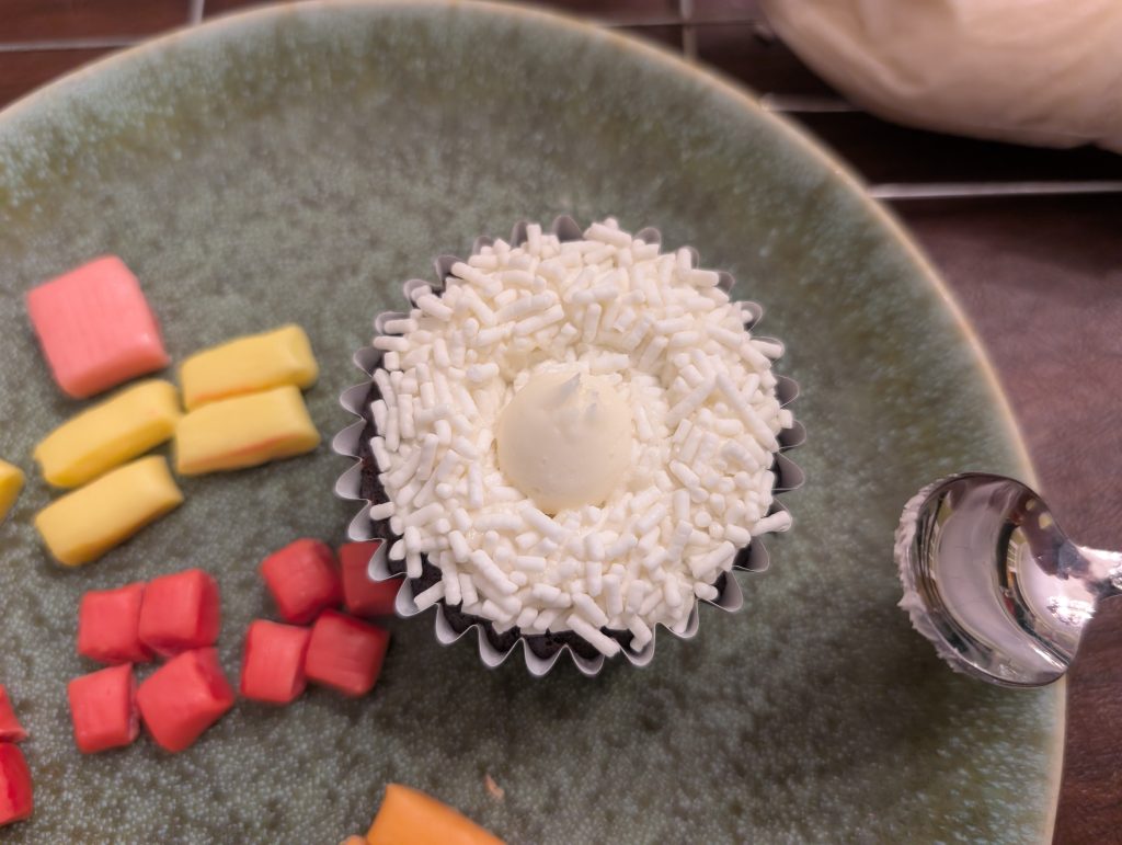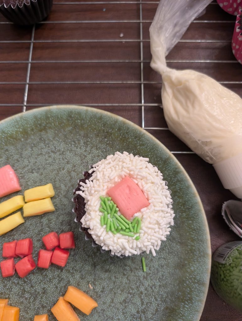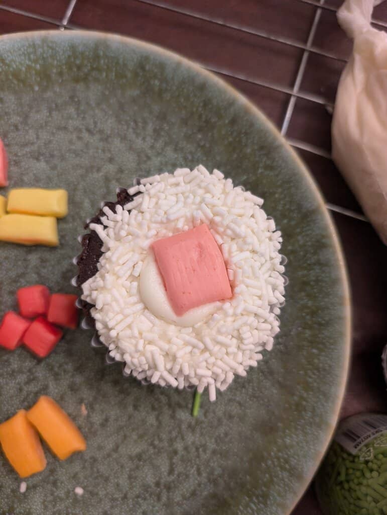 I piped a dollop of icing in the center of the cupcake. (I’m not sure why they rose and fell but it actually was perfect for the sushi cupcakes.)
