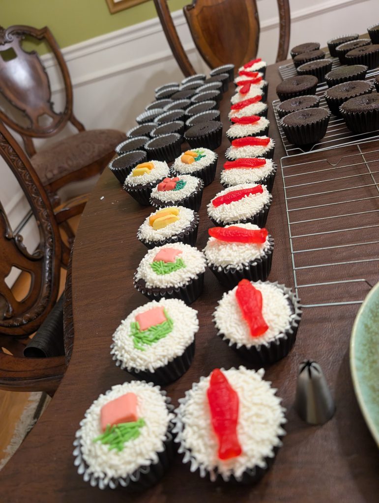 So all that was left for me to do after Patricia’s party was cupcakes! I made another batch of chocolate cupcakes (after freezing 72 a few days before) because I wanted to be sure to have enough for everyone invited. I defrosted the last 30 and started on the icing after everything was cooled and defrosted. I had a Pinterest board of cupcake ideas for his party, but I couldn’t come up with anything clever that was electric car related. He saw on the board some sushi cupcakes I’d pinned and decided that was a way cuter idea. There are a lot of variants of sushi cupcakes online and this was my variant. I didn’t want to make fondant fish like some of the super cool ones did. So this version was pretty easy and they came out great!