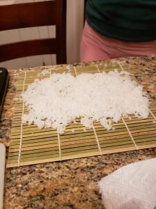 Now it’s time to get rolling! Place rice on the bottom edge of your mat, pressing with the back of a spoon to form a rough rectangle about 7″ wide by 4″ high. Place a half sheet of nori (shiny side up) on the rice and press down firmly to flatten out the rice a bit more. At the bottom edge of the rice/nori place a couple layers of avocado slices, overlapping. In front of that place 2 or 3 layers of tempura sweet potato.
