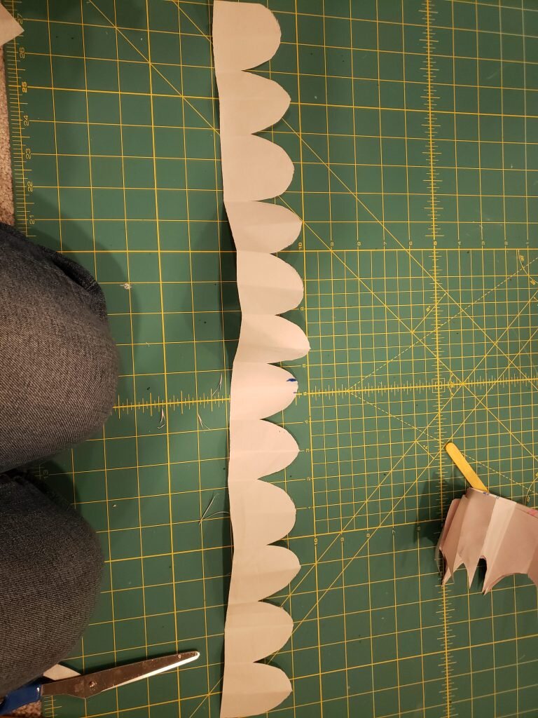 - Next make the template for your shark teeth. I measured the length of the hood and then took a piece of scrap paper that wide and folded it until it was the width I wanted for each tooth. Then, paper snowflake style, I cut out one tooth, leaving a 1″ base.