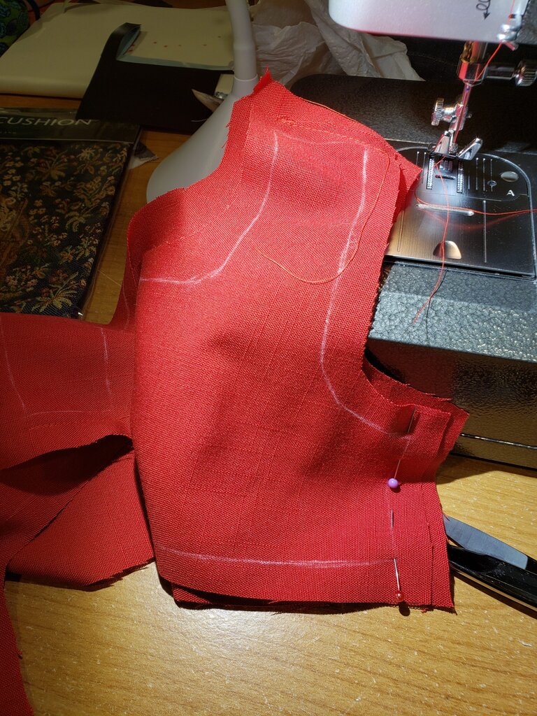 5. Place bodice outside and bodice lining right sides together and stitch all along the neck and front edges.
