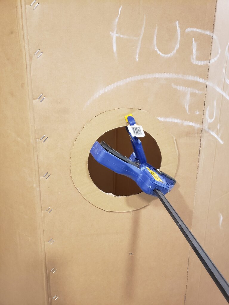 - Make a window frame (or window frames) by drawing two concentric circles on scrap cardboard from the box used to make the fins, then cutting them and removing the center circle. I then glued them over the holes I cut for windows using wood glue.