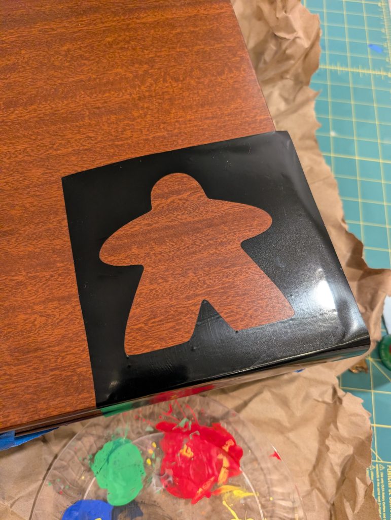 The first step I did was removing all the gross interior fabric, and fabric on the bottom of the box. It was in pretty bad shape. I then added a clasp mechanism (taken from the first box I bought, and added a handle for carrying like a suitcase. I added felt to the bottom again, and inside the box I added a strap and pouch to the top area to store game boards and instructions. On the bottom I added a couple slots the width of a standard deck of cards and used balsa wood strips to create dividers. On the outside I added some gilding. (though I realized afterwards that I put the gold meeple the wrong side up in my opinion!)